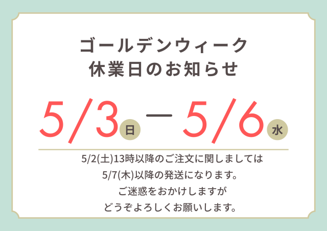 当面の間、すべてのご注文につきまして通常より2~営業日程度出荷が遅れる見込みとなっております。
