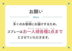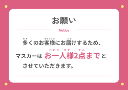 誠に恐れ入りますが、実店舗の販売も購入制限を設けさせてもらっております。